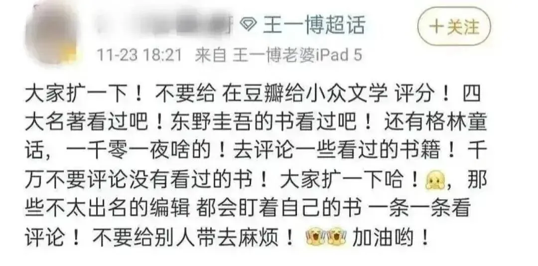 2021年左右的“豆瓣养号事件”就是个例子。豆瓣本来是给人聊书的地方,结果一些饭圈女孩为了把账号权重养高,跑去给豆瓣首页随机推荐的新书批量打分,复制粘贴“好看好看挺好看”“作者文笔流畅,情节引人入胜”这种短评——其实根本就没看过。